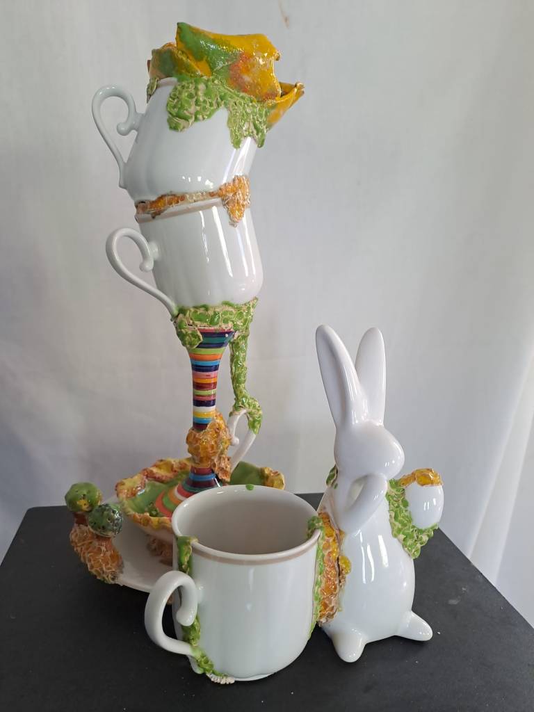Soms is hergebruik van bestaand servies, het gebruik van gietvormen, of een combinatie van zelf gemaakt en andere keramiek ook een deel van mijn werk.